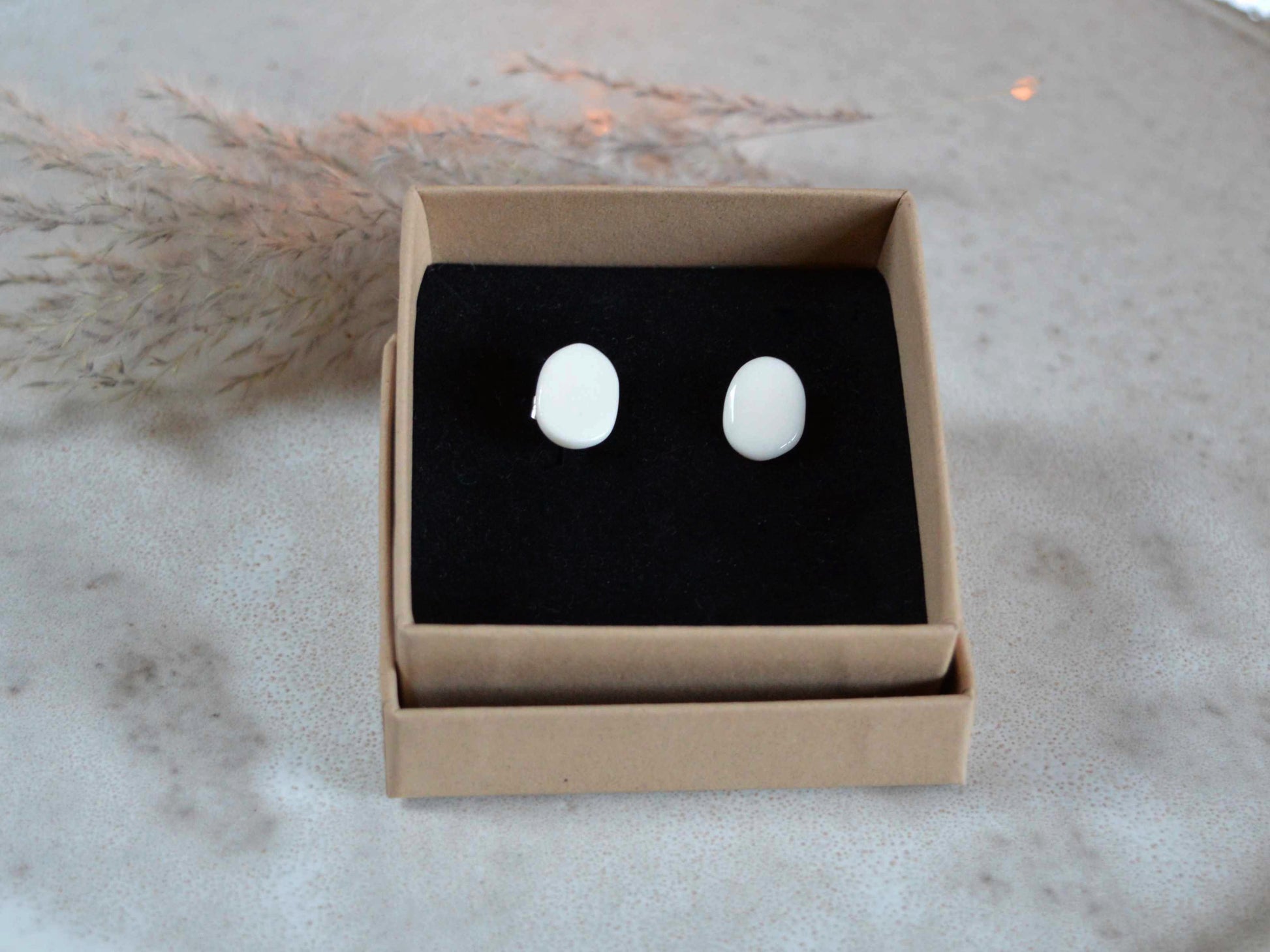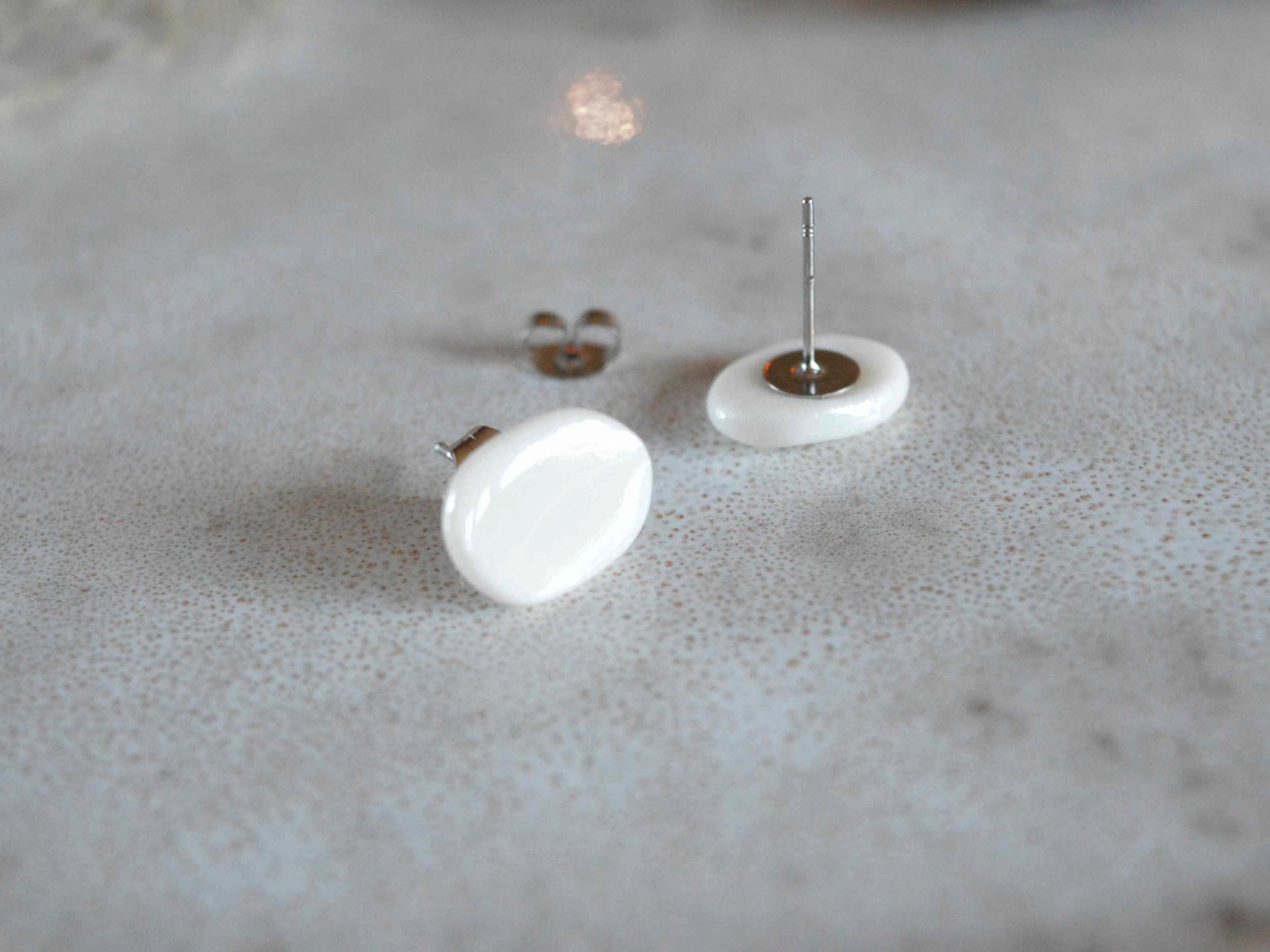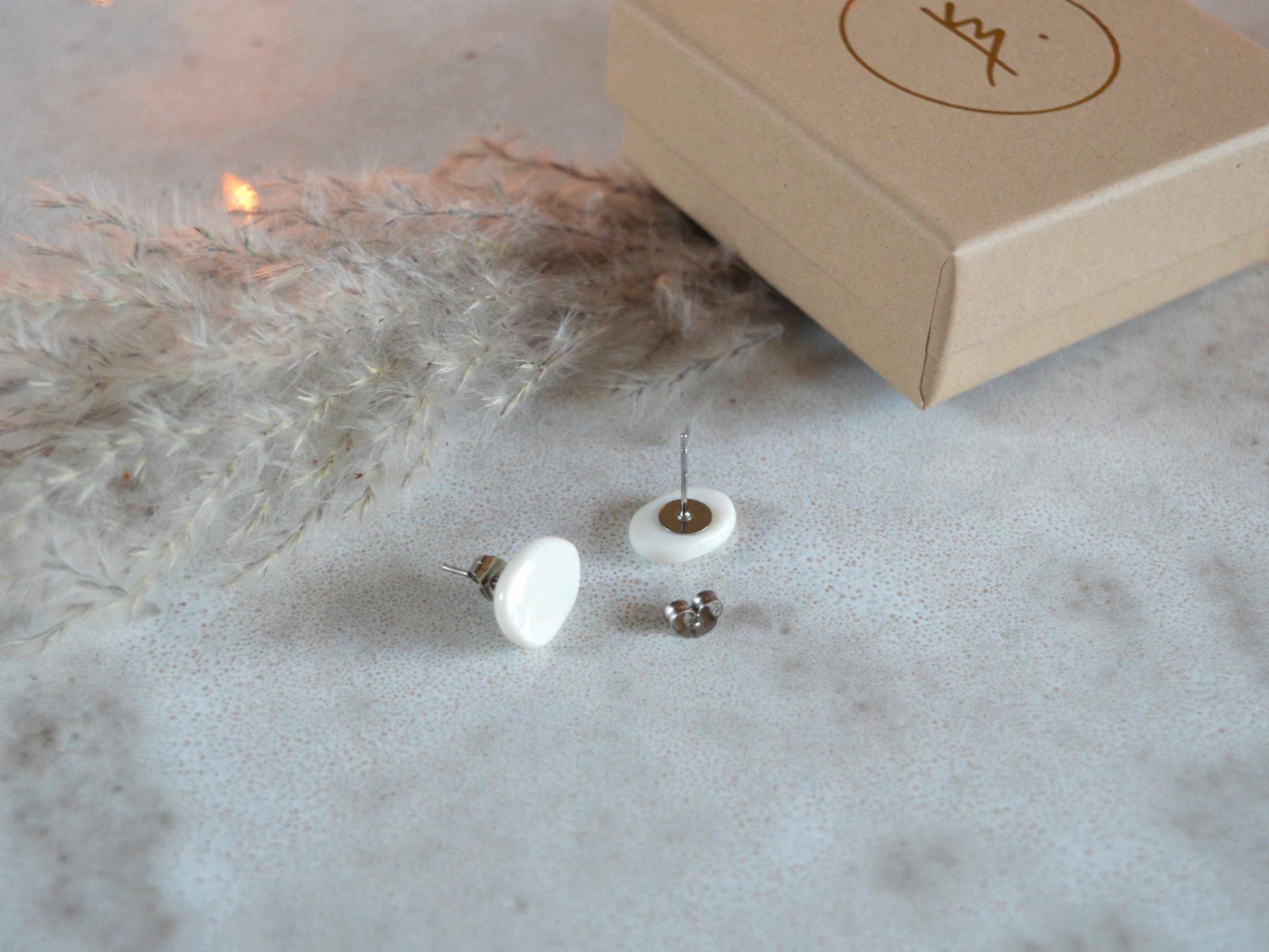 Progetto e creo ogni paio nel mio studio a Modena. Gli orecchini sono modellati a mano in argilla di porcellana bianca, cotti ad alta temperatura, smaltati con una finitura trasparente e cotti nuovamente fino a 1250 °C per garantire resistenza e durata.